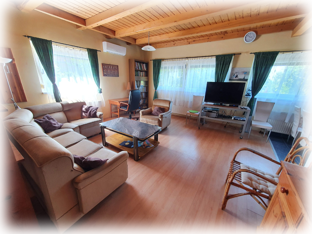 ...A nagy nappaliban ülőgarnitúra, íróasztal, TV 4 műhold (Astra, Hotbird, Thor, Amos) adásaival, CD lejátszó a felszereltség...